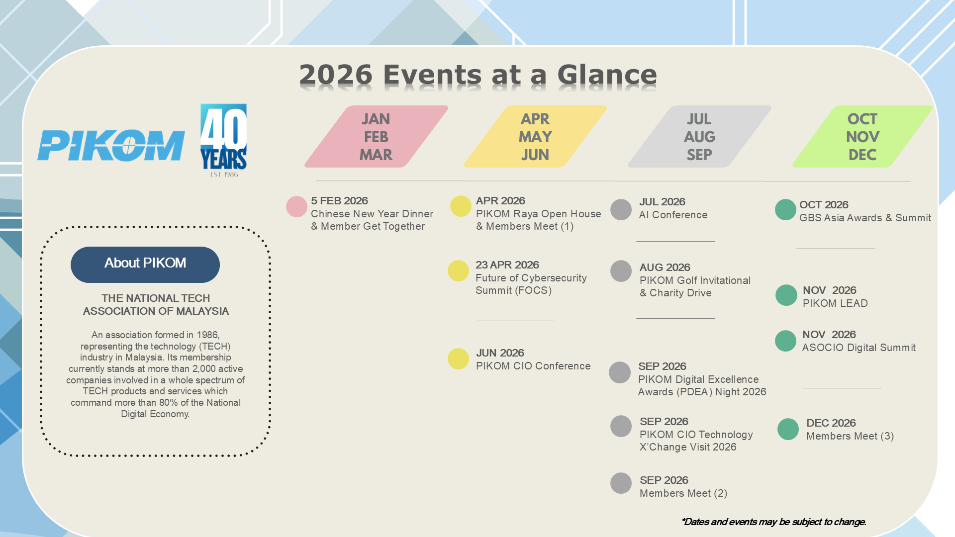 Events2025 CNY Networking Dinner - 5th Feb 2026 Read More GBS ASEAN SUMMIT 2025 - 30th October 2025 Read More GBS ASEAN AWARDS 2025 - 30th October 2025 Read More PIKOM LEAD - 25th November 2025 Read More PIKOM DIGITAL EXCELLENCE AWARDS Read More PIKOM Golf - 9th July 2025 Read More PIKOM CIO Conference - 10th June 2025 Read More PIKOM RAYA OPEN HOUSE Read More Future of Cybersecurity Summit - 16th April 2025 Read More Women in Tech - 9th April 2025 Read More PIKOM E-Invoicing Webinar Series - 6 / 11 /19 March 2025 Read More PCC Northern Region Conference 2025 Read More Sponsor The Celebration - Chinese New Year Read More